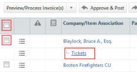 The Tickets grouping row (there is only ever one per organization row) includes all billing items (labor, charges, expenses) that are associated with tickets for the organization in the row above it, as long as those billing items do not have purchase order numbers. To launch the Process Selected Invoices dialog box for items in this grouping, click the Tickets label. |