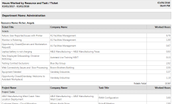 Details about tasks, tickets and regular time for specified resource(s) and a specified date range, sorted by resource or organization and project. This report shows both pre-billed and billed work. |