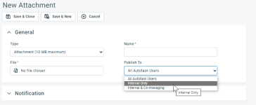 When you add an attachment to other entities, the Publish To setting will be respected. If the Publish To option is set to Internal Users, the notification email is sent to all recipients, but external users will not receive the attachments.