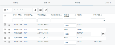 Check All / Check None | Selecting at least one invoice enables the Email Selected Invoices button on the button bar. This check box is disabled for organizations that do not have invoice emailing enabled, and for invoices that have been voided. |