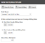 The Role Block Hour Multiplier is displayed. This multiplier will determine how many block hours will be consumed for each hour of labor that uses the role. You can modify this factor as needed. NOTE Do not set Block Hour contract rates to 0.00. Billable labor that has a contract rate = 0.00 will not be deducted from the contract block, even if block hours are available. For details on block billing rules, refer to Billing rules when no blocks or purchases are available. |