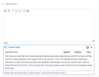 Click Append to add the generated text to the Resolution field or Replace to replace any existing text.