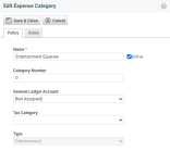 Active | With this check box selected, the Expense Category is active. Clear the check box to inactivate the category. An inactive expense category is not available for selection when adding or editing an expense item. |