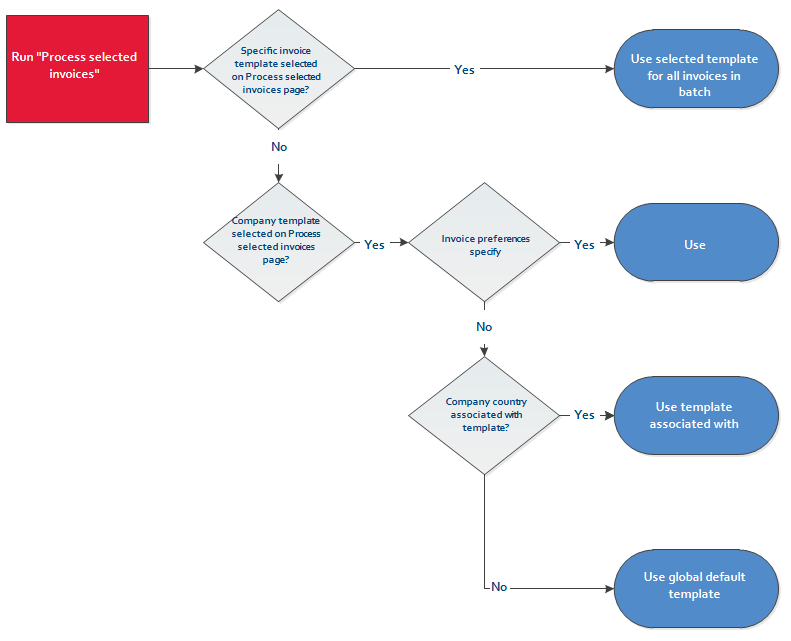 This action is a one-time override of default invoice settings at the organization or country level. The alternative template can be selected on the Invoice Preview and Process Selected Invoices pages. For more information, refer to Viewing invoices and Processing invoices.