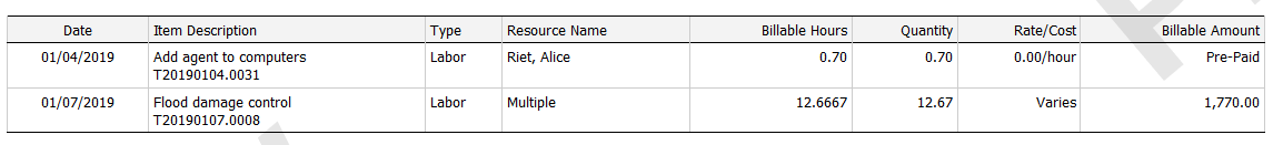 EXAMPLE For example, the invoice preview below shows two billing items, each for a different ticket. The display lists details for the one labor item included in billing item 1 and the four labor items rolled into billing item 2.