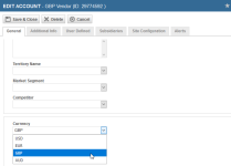 With Multi-currency enabled, the Currency field is displayed. The default setting is your internal currency. If you have selected a country that is associated with a different currency, the country currency is the default. Refer to Managing your Countries list.