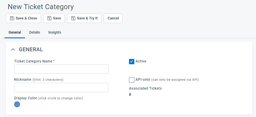 Ticket page elements and field descriptions - If you are creating or editing a ticket category, click Save & Try It to preview how your ticket interface will look with the current ticket category settings.