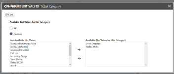 When you create a ticket category, you can also control which other categories it can be changed into (when in Edit mode) and viewed as (when in Detail mode). You do this by editing the Available List Values for this Category in the Header section of the General tab.