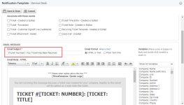 - Edit each active notification template for all events and add the [Ticket: Number] - [Ticket: Title] variables into the Email Subject field. Do not add any other text in the Email Subject field.