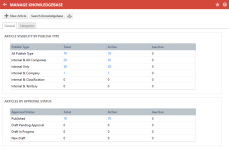 The columns of the summary tables show the number of articles or documents by Publish Type and Approval Status. The aggregate numbers are hyperlinks, and clicking them will show the search results for the selected criteria.