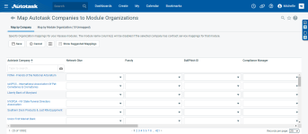 In addition to the Save, Cancel, and Column Chooser buttons, the Show Suggested Mappings button appears above the table. If you click this button, Autotask will use fuzzy logic to help you map module organizations to the Autotask organization. The following rules apply: