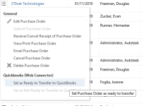 Purchase orders, timesheets and expense reports are set to the Set as Ready to Transfer to QuickBooks status on the respective Search page for the item: