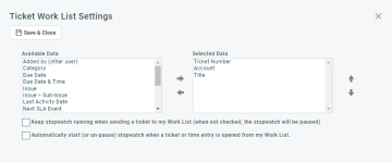Clear the check box to pause the work list stopwatch when the ticket or task is sent to the Work List (if it was running on the Ticket or Task page when added to the work list).