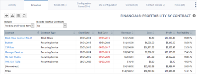 The Profitability by Contract table shows you revenue, costs, profit, and profitability by each of this organization's contracts, allowing you to see not only how profitable each contract is, but also how much revenue you are realizing and the costs you are incurring for each contract. For an overview of what is included, refer to Revenue and cost items included at the organization, contract, and project level.