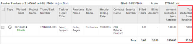 You can view the total amount deducted from a contract's retainer purchases in the Contract Details box on the Summary page.