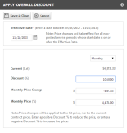 For example, if you have a monthly contract with a Current (List) price of $500 and you enter 10.00 into the Discount (%) field, the Monthly Price Change will display -50.00 and the Monthly Price After Discount will display $450.00.