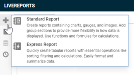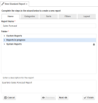 • The Standard Report option allows for more advanced formatting options than are available in express reports. You set up your report through the New Report wizard and once you click the Finish button, the advanced editor page opens. Use this option for more complex reports or when you want to use more advanced formatting options.