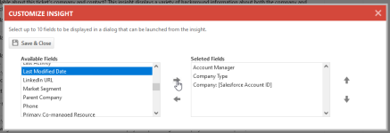 The Customize Insight dialog window will appear. Square brackets around a field name indicate that the field is a UDF. - Using the Left and Right arrows, move fields from the Available Fields list to the Selected Fields list. You can select up to 10 fields. Protected and private fields cannot be selected.