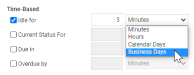 IMPORTANT The events Idle for, Due in, Overdue by, and Current Status for are not valid when the condition Status is equal to Complete.